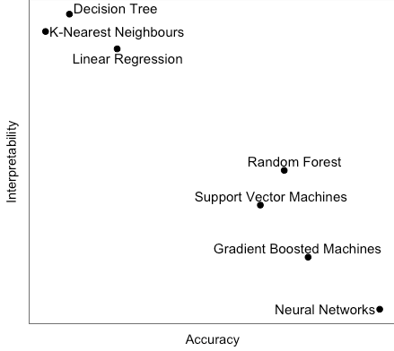 Other interpretable models do exist - k-Nearest Neighbours; Naive Bayes, for example, but they still suffer from an accuracy deficit (generally) when compared with more sophisticated methods. The following graph displays this conundrum: