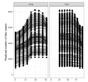 Similarly, an Individual Conditional Expectations (ICE) plot visualises the dependence of the predicted response on a feature for EACH instance separately, resulting in multiple lines, compared to one line in PDP.