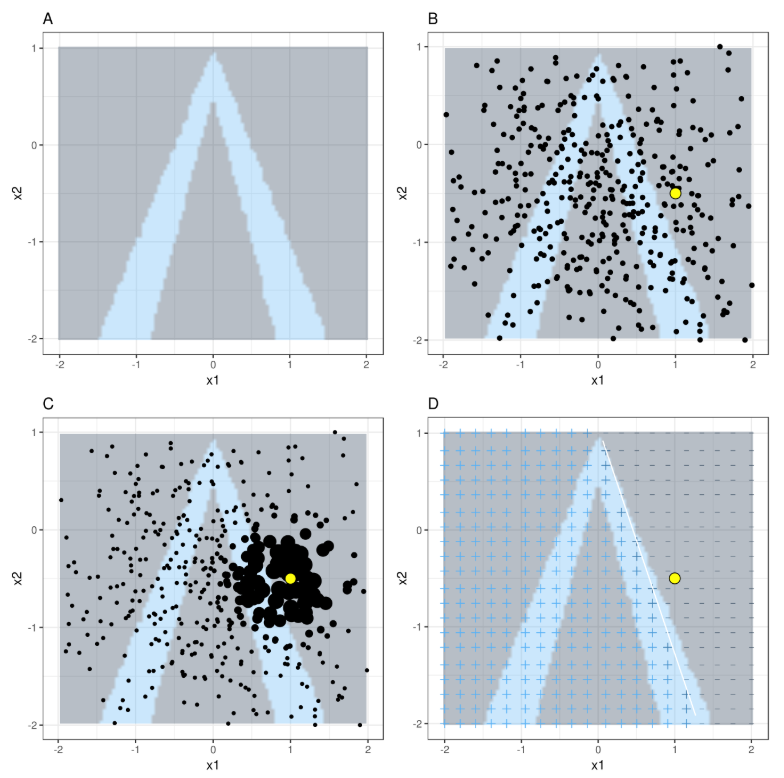 The procedure for using LIME is fairly simple. A number of datapoints are sampled from a normal distribution around the mean of the features in the training data. A point of interest is selected and the sampled points around the point of interest are given a higher weighting. An ’explainable’ (e.g. linear) model is then fit to these points, creating a decision boundary at the local level which is relatively straightforward to interpret.