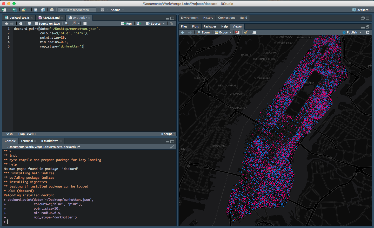 To fully utilise deck.gl we wanted to integrate it with our existing workflow which is predominately in R, where we leverage some of the amazing spatial packages like sf, sp and leaflet. So we created a package that allows you to visualise data in deck.gl directly from R, either in the Viewer, Markdown Docs or using Shiny.
